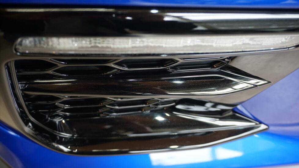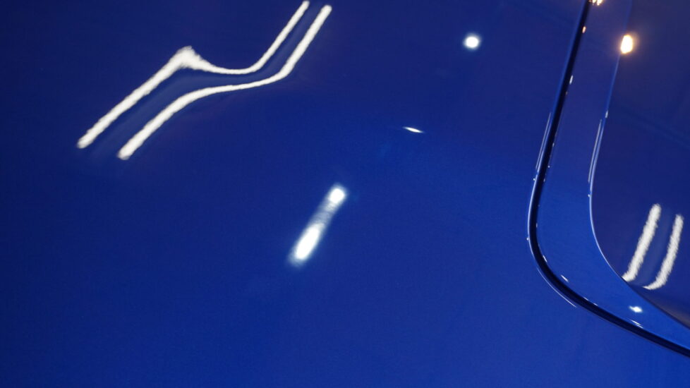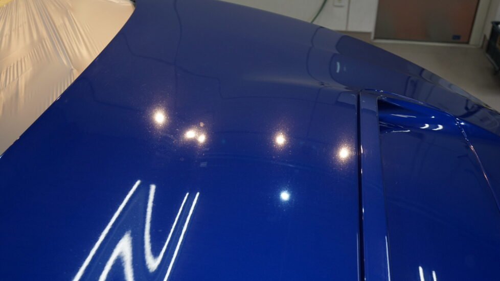 ブルーカラーのパネルに白い斑点模様がわかりますか?ケミカル除去→ねんど除去→研磨→グレイジング→研磨→コーティングで