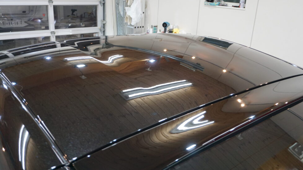 雹被害による凹みボンネット9ヶ所、ルーフ48ヶ所、右フェンダー3ヶ所、リアゲート1ヶ所のデントリペア修理