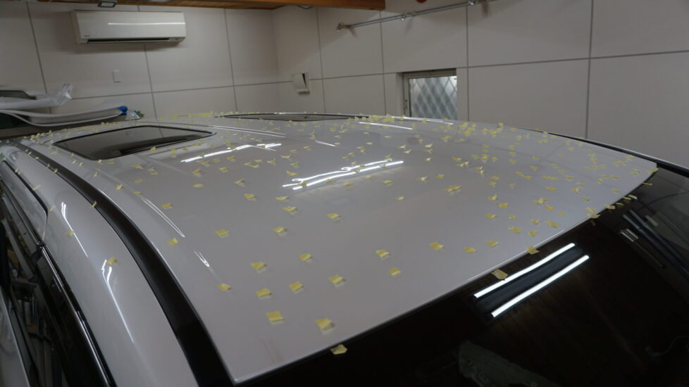 雹被害 ルーフ450ヶ所、左右ピラー部59ヶ所、右フェンダー10ヶ所、他16ヶ所、合計565ヶ所のデントリペア修理