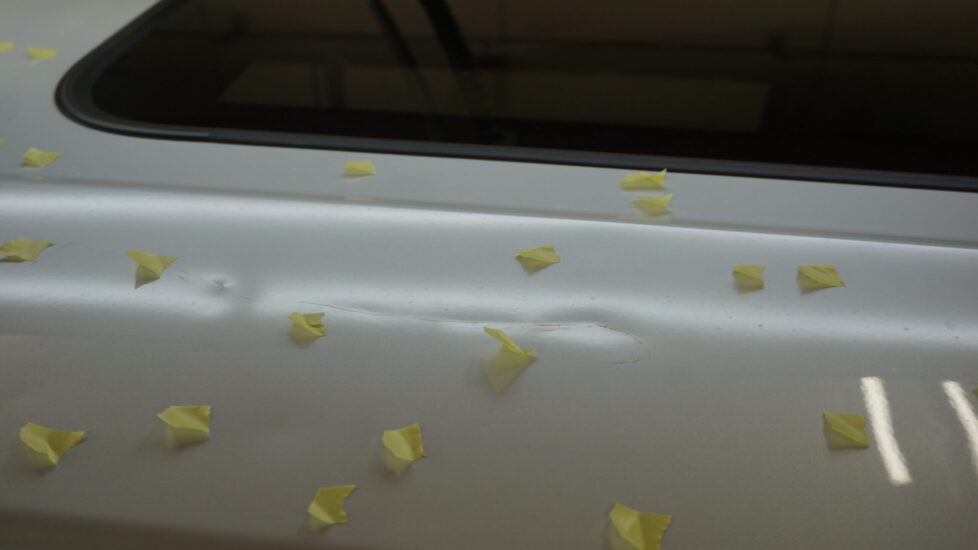 1日目はまず洗車して出来るだけシミなども落として凹みをわかりやすくしておいて、凹みには一つ一つマスキングテープでマーキング